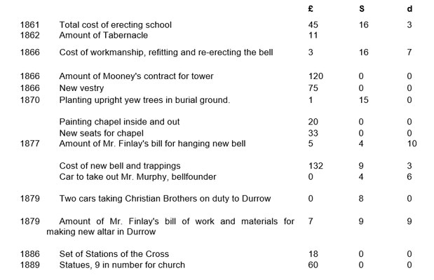 Some of the early refurbishment works on the church are recounted in a surviving manuscript accounts book from 1857 to 1889. This volume dates from the appointment of Dr. McAlroy as parish priest in succession to the parish priest responsible for the erection of Durrow church, Revd. Dr. James O’Rafferty, (parish priest 1820-57). Dr. O’Rafferty originally buried in a crypt in the church (his remains now lie in the adjoining cemetry) and is commemorated with a mural tablet in the church and, significantly, the construction of the bell tower at the western end in 1866.