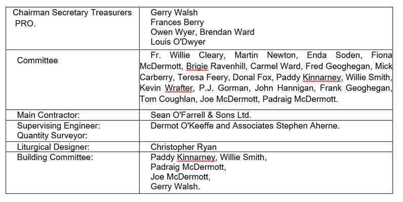 A second opinion on the condition of the church was obtained and the committee also discussed the building of a new church on the same site. The second opinion confirmed the poor condition of the building. The committee decided to continue with their brief of renovation and Dermot O’Keeffe Associates were appointed Consulting Engineers and Stephen Ahern as Quantity Surveyor.