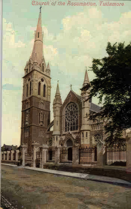 A large and important church was dedicated on Sunday week by the Most Revd. Dr. Gaughran, Bishop of Meath, at Tullamore. The church, which has but recently been completed, was designed by the late Mr William Hague, and built under the supervision of Mr. T.F. McNamera, of Dublin. The building, which is Gothic, is about 200 feet from the ground, 172 feet is the length from outside east wall to the west door, the nave 36 feet wide, side aisles 18 feet wide each. The sanctuary has on each side two chapels, behind one of which is the sacristy, and near the other a well-lighted room reserved for the nuns who have easy access to their convent. The chancel arch rests on two columns and smaller pillars of Galway granite. Over the altars the groined roof is of fibrous plaster, while that of the centre is of pitch pine. The windows contain cathedral glass, and perfection appears to have been reached in the ventilation, heating, and lighting, the last being by means of electric installation. At the west end is the organ, an instrument the look of which is in harmony with the whole edifice, and was supplied by Telford, of Dublin. The High Alter is a magnificent proof of the sculptor’s art. It is of Sicilian marble with panels of Carara and shafts of Cork and Connemara marble, the artists being Messrs. Malone, also of Dublin. There are already also stained glass windows and the Stations, in oils. The stone materials were taken from the local quarries and, as far as possible, local tradesmen and labourers were employed throughout. . .